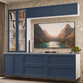 O conjunto é composto por gavetas e armários amplos, um armário com portas de vidro, que pode ser utilizadocomo cristaleira ou livreiro. Essa combinação permite acomodar uma TV, organizar livros, louças e itens decorativos com facilidade. O acabamento da estrutura é em Branco e das frentes em Azul, possui alta resistência, trazendo um visual sofisticado e textura suave ao toque.