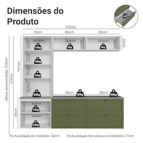 - 52cm de profundidade nos balcões e 31cm nos aéreos e cristaleira