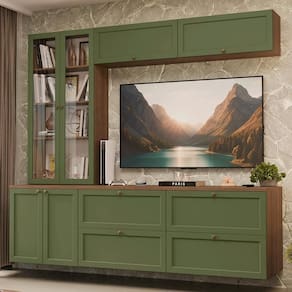 O conjunto é composto por gavetas e armários amplos, um armário com portas de vidro, que pode ser como cristaleira ou livreiro. Essa combinação permite acomodar uma , organizar livros, louças e itens decorativos com facilidade. O acabamento da estrutura é no tom amadeirado Rustic e das frentes em Verde, possui alta resistência, trazendo um visual sofisticado e textura suave ao toque.