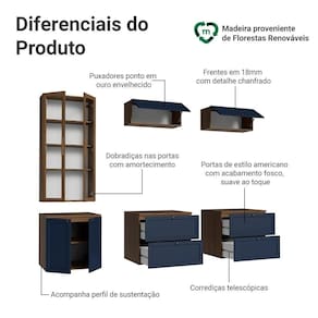 O conjunto é composto por gavetas e armários amplos, um armário com portas de vidro, que pode ser como cristaleira ou livreiro. Essa combinação permite acomodar uma , organizar livros, louças e itens decorativos com facilidade. O acabamento da estrutura é no tom amadeirado Rustic, das frentes em Azul e da cristaleira em Rustic também, possui alta resistência e textura suave ao toque.