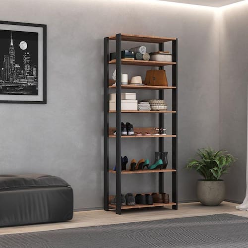 Com design moderno e minimalista o Multiuso Industrial é ideal para otimizar o espaço do seu dormitório. Agrega resistência e beleza, ajudando a organizar ambientes e oferece espaço para as suas vestimentas e acessórios, calçados, roupas de cama e até itens decorativos. É produzido 100% em BP, excelente padrão de acabamento nas cores Preto Fosco com Solanum, que aumenta a durabilidade do móvel e possui maior resistência a riscos e a umidade. Seu sistema de montagem prático e descomplicado, realizado através de parafusos, minifix e cavilhas. Possui estrutura de 15mm e pés de 18mm. Fixação na parede com cantoneira 3 furos. Kit extra com parafusos e tapa furos incluso na ferragem para fixação de conjuntos. Medidas montado (A x L x P): 183 x 70 x 36 cm. Acabamento da Prateleira: BP Altura dos Pés: 183 cm Ambiente Principal: Quarto Complexidade da Montagem: Baixa: pode ser montado por uma pessoa sozinha Cor: Preto/Solanum Cor do Produto: Preto/Solanum Cor Interna: Preto/Solanum Escala de Brilho: Fosco Escala de Brilho da Prateleira: Fosco Itens Inclusos: 1 Sapateira, Kit Ferragens e Manual de Montagem Manual de Montagem e Instalação: https://product-hub-prd.madeiramadeira.com.br/721736/documents/65f098f3-c1c2-4f7d-85f1-2677ac3b196d915758m121sapateira.pdf Material da Prateleira: MDP Material dos Pés: MDF Material Principal: MDF/MDP Necessita Montagem: Sim Origem do Produto: Nacional Peso: 24 kg Peso Máximo por Prateleira: 10 kg Possui Espelho: Não Possui Possui Pés: 04 Possui Portas: Não Possui Prateleiras: 07 Possui Rodízio: Não Recomendações de Uso, Manutenção e Limpeza: Limpar com flanela ou pano macio seco, não utilizar produtos abrasivos, desengordurantes, álcool ou solvente. Não expor o produto diretamente à luz solar e à umidade. Sapatas Niveladoras: Não Sistema de Montagem: Parafusos, minifix e cavilhas. Suporta Até (kg): 70 kg Ean: 7909903048351