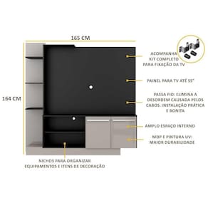 Produzido em MDP com pintura UV, que garante maior durabilidade e resistência,possui painel para TV de até 55com espaçamento para a passagem dos fios, o que deixa um visual mais clean e os cabos organizados. Possui prateleiras que podem ser utilizadas para artigos decorativos e/ou equipamentos e 2 portas com um amplo espaço interno para manter seus pertences organizados.