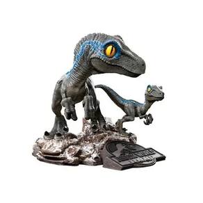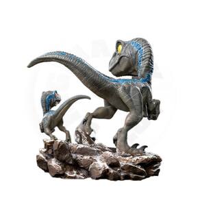 Correndo e caçando juntas, a mamãe Velociraptor e sua filhote, uma versão menor igualzinha a ela, seguem em sua descoberta de um novo mundo. Como se estivessem sorrindo uma para outra, sobre uma base de rochas cobertas por neve com o logotipo do filme à sua frente, a Iron Studios apresenta a estátua " Blue and Beta - Jurassic World: Dominion - MiniCo", com a mais amada dinossauro de Jurassic World e sua filhote tal como apresentadas no trailler do filme que completa a trilogia.