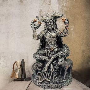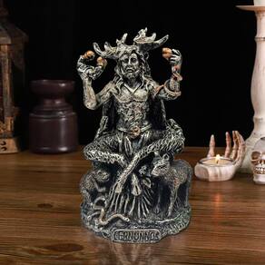 Material: Resina Tamanho: 17,5* 9,5* 11,5 cm Peso: 100g Cernunnos Divindade celta: esta estátua lindamente trabalhada representa Cernunnos, o deus celta dos animais e da natureza, com detalhes intrincados como chifres, cobras e veados. Resina de alta qualidade: feita de resina durável, esta estatueta apresenta um excelente artesanato com acabamento prateado, perfeita para adicionar energia mística a qualquer espaço. Design inspirado na natureza: O design incorpora elementos da natureza, com Cernunnos cercados por animais e símbolos naturais, incorporando a reverência celta pela vida selvagem e pela floresta. Tamanho ideal: com 17,5 x 9,5 x 11,5 cm, esta estátua compacta é perfeita para ser exibida em estantes de livros, mesas ou altares, trazendo um toque espiritual a qualquer ambiente. Decoração versátil: seja colocada em sua sala de estar, jardim ou em um altar pagão, esta estátua complementa interiores com temas modernos e antigos com seu apelo mítico.