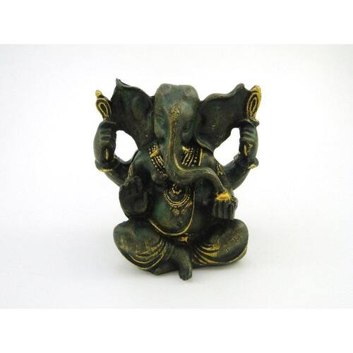 Estátua Ganesha Sentado Verde e Dourado Resina 12 cm Ganesha: Filho mais velho de Shiva e Parvati. Tem uma enorme cabeça de elefante em um corpo de menino. Conhecido como aquele que destrói os obstáculos e ajuda na conquista da fortuna. Produto pintado a mão, podendo sofrer variações de cores. Marca: Não Informado