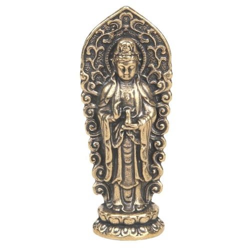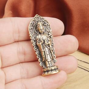 Material: latão Tamanho: 49 mm Peso: 100 g Design clássico de Guanyin: Esta escultura vintage de latão apresenta o venerado Guanyin, também conhecido como Avalokitesvara, o Bodhisattva da Compaixão, simbolizando misericórdia e cura. Material de latão premium: feita de latão de alta qualidade com acabamento antigo, esta escultura irradia elegância e adiciona um toque atemporal à sua decoração espiritual ou doméstica. Tamanho compacto: com um tamanho de 49 mm e pesando 100 g, esta estátua é um complemento ideal para seu espaço de meditação, altar ou como peça decorativa para sua casa ou escritório. Símbolo da Compaixão: A representação de Guanyin com um lótus na mão serve como um lembrete de paz e compaixão, tornando-a um ornamento espiritual perfeito para a cura e o crescimento pessoal. Artesanato artesanal: cada estátua é meticulosamente feita à mão para garantir detalhes finos e um acabamento exclusivo, tornando-a uma adição excepcional à sua coleção.