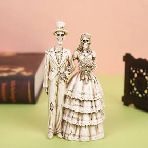 Material do produto: resina Peso do produto: 150 g Tamanho: 8* 6* 15 cm Design exclusivo de casal esquelético — apresenta um esqueleto de noiva e noivo de braços dados, combinando romance gótico com um toque de humor, perfeito para Halloween ou decoração temática. Acabamento vintage envelhecido — escultura detalhada em resina com textura de estilo antigo e detalhes esculpidos, criando um visual retrô atraente que combina com interiores rústicos ou góticos. Material de resina durável — Feito de resina de alta qualidade, resistente e leve, garantindo o uso a longo prazo e mantendo intactos padrões e detalhes intrincados. Tamanho de tela compacto — mede aproximadamente 8 × 6 × 15 cm (3 × 2,3 × 6 pol.), ideal para mesas, cornijas, prateleiras ou telas de entrada sem ocupar muito espaço. Enfeite de casa versátil — Ótimo como estatueta decorativa para festas de Halloween, casamentos com temas góticos, salas de estar ou jardins, adicionando charme assustador a qualquer espaço.