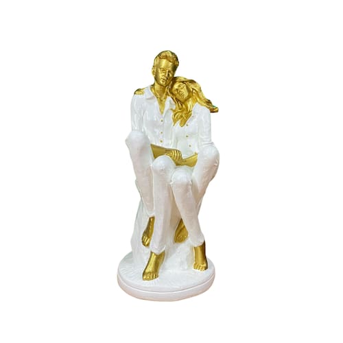 Uma cena de puro carinho: esta estatueta retrata um casal apaixonado sentado lado a lado, compartilhando um momento de afeto e tranquilidade. A mulher repousa a cabeça sobre o ombro do homem, representando confiança, conforto e cumplicidade.