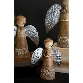 Esses anjos de mesa de madeira e estanho com corpos esculpidos e asas marteladas são uma adição única à sua decoração natalina. Coloque-os em seu manto ou ao redor de seu presépio para representar a hóstia celestial. Este conjunto de três é feito na Índia. O