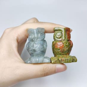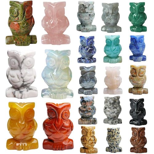 Estatuetas de Coruja de Pedra Preciosa: As corujas de cristal são símbolos de sabedoria e feminilidade, desta forma as corujas de pedra preciosa esculpidas à mão fariam uma ótima adição a qualquer coleção, as corujas também são um simbolismo de vida nova e deixar de lado coisas que não nos servem mais.