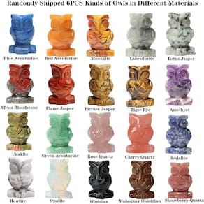 Pacote de estátua de coruja de pedra preciosa: Misture corujas 6PCS; 1,5" de altura; Largura: 1"-1.2"; Altura: 1.3"-1.5"; Peso: 20-28g. Vamos enviar 6PCS tipos de corujas em cores diferentes, os materiais são enviados aleatoriamente e não serão cores duplicadas.