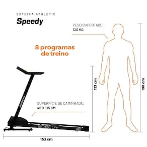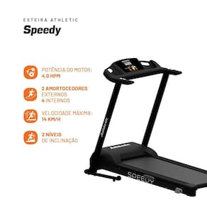 Especificações TécnicasProduto: Esteira Elétrica Athletic SpeedyCódigo do fabricante: 03878EAN: 7899964022325Marca: AthleticModelo: Athletic Speedy 14 km/hLinha: ResidencialIndicado para Uso: ResidencialVelocidade Mínima: 1 km/hVelocidade Máxima: 14 km/hPotência do Motor: HPMTipo do Motor: Corrente contínua DCSuperfície de Caminhada/Corrida: 40 x 115 cmSistema de Inclinação: Com 2 níveisTipo de Inclinação: ManualProgramas de Treino: 13 programasAmortecedores: 6 amortecedores (2 externos e 4 internos)Dobrável: Sim (com sistema Guarda-Fácil)Peso Máximo Suportado pelo Usuário: 120 kgFunções do Monitor: 10 Funções (Velocidade, Tempo, Distância, Calorias, Batimentos Cardíacos, Scan, Sleep, THR, IMC, Recuperação Pós Treino)Sensor de Batimentos Cardíacos: Sim (Sistema Hand Grip)Display: LCDAlimentação do Monitor: Duas pilhas AARodas para : Sim (duas rodas dianteiras)Porta Objetos: SimSistema de : Chave de para parada de emergência, lona antiderrapante e carenagem de proteção no motorLona: Fácil de ajustarPlataforma: Em MaDeFibra BP laminado melamínico de 18mm com maior qualidade e durabilidade mais longa e acabamento com resina especialLubrificação: Manual (aplicação fácil, usar silicone específico)Tipo de Exercício: Aeróbico, Condicionamento Físico, Resistência, HIIT, Fortalecimento Muscular, Perda de PesoPartes do Corpo Trabalhados: Pernas, Costas, Abdominais e GlúteosExercícios Possíveis: 3 (Caminhadas, trotes e corridas)Tamanho: ÚnicoCor: PretoVoltagem: BivoltEstrutura: Aço carbonoPintura: Eletrostática a pó, alta resistência a corrosãoDimensões Aproximadas Montada (A x L x C): 121 x 72 x 153 cmPeso Líquido: 36 kgComposição: Aço, MaDeFibra e PlásticoCuidados com o Produto: Manter a lubrificação em dia, a limpeza deve ser feita com pano úmidoGarantia: 1 ano (Consultar o manual)Assistência Técnica: A Athletic possui uma rede de assistência técnicaMontagem: Fácil (sistema de montagem easy fast)Condição do Produto: NovoItens da Caixa: 1 Esteira ergométrica, 1 chave de , 1 manual do usuário, 1 Kit de montagemDimensões Embaladas (A x L x C): 31,7 x 75,7 x 160,9 cmPeso Embalada: 40 kgFabricante: Athletic