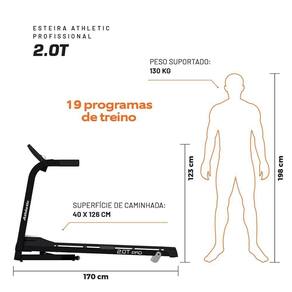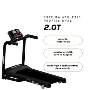 Especificações TécnicasProduto: Esteira Ergométrica Athletic 2.0TMarca: AthleticModelo: 2.0TLinha: SemiprofissionalIndicado para Uso: Residencial, Condomínio, Construtoras, Studio e HotéisTipo de Esteira: Elétrica, DobrávelVelocidade Mínima: 1 km/hVelocidade Máxima: 16 km/hPotência do Motor: HPTipo do Motor: Corrente Alternada AC (Motor WEG)Superfície de Caminhada/Corrida: 40 x 128 cmSistema de Inclinação: Com 2 níveisTipo de Inclinação: ManualProgramas de Treino: 26 programasAmortecedores: 8 Amortecedores InternosDobrável: Sim (com sistema Guarda-Fácil vertical)Peso Máximo Suportado pelo Usuário: 130 kgFunções do Monitor: 16 Funções (Velocidade, Tempo, Distância, Calorias, Batimentos Cardíacos, ODO, Scan, Sleep, Gráfico Programa, Acesso Velocidade rápida, THR, IMC, Recuperação pós treino, Programação Contagem Regressiva Cal/Dis/Time)Sensor de Batimentos Cardíacos: Sim (Sistema Hand Grip)Display: LCD blue backlightAlimentação do Monitor: Via cabo de energiaTecla de Atalho: No monitor (6 teclas de atalho de velocidade)Porta Objetos: SimSistema de : Chave de para parada de emergência, lona antiderrapante e carenagem de proteção no motorLona: Fácil de ajustarPlataforma: Em MaDeFibra BP laminado melamínico de 18mm com acabamento com resina especialLubrificação: Manual (aplicação fácil, usar silicone específico)Tipo de Exercício: Aeróbico, Condicionamento Físico, Resistência, HIIT, Fortalecimento Muscular, Perda de PesoPartes do Corpo Trabalhadas: Pernas, Costas, Abdominais e GlúteosExercícios Possíveis: Caminhadas, trotes e corridasTamanho: ÚnicoCor: EscuroEstrutura: Aço carbonoPintura: Eletrostática a pó, alta resistência a corrosãoDimensões Aproximadas Montada (A x L x C): 123 x 73 x 170 cmPeso Líquido: 42,4 kgComposição: Aço, MaDeFibra e PlásticoCuidados com o Produto: Manter a lubrificação em dia, a limpeza deve ser feita com pano úmidoGarantia: 1 ano (Consultar o manual)Assistência Técnica: A Athletic possui uma rede de assistência técnicaMontagem: Fácil (sistema de montagem easy fast)Condição do Produto: NovoItens da Caixa: 1 Esteira ergométrica, 1 chave de , 1 manual do usuário, 1 Kit de montagemDimensões Embaladas (A x L x C): 33 x 83 x 177 cmPeso Embalada: 46,8 kgFabricante: AthleticRodas para : Sim (duas rodas dianteiras)Voltagem: 110 ou 220 (escolher no ato da compra)