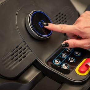 Painel em LCD com iluminação azul (Blue Backlight) que mede tempo, velocidade, distância, calorias, programas, nível de inclinação eletrônica e batimentos cardíacos