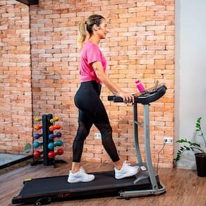 Esse modelo foi pensado para otimizar o espaço ocupado na sua residência. Ela é compacta e dobrável, além de possuir rodinhas para o transporte. Ideal para quem busca uma esteira para caminhar em casa, com praticidade!