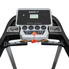 O painel exibe tempo, calorias, velocidade, distância e batimentos cardíacos medidos através do hand grip. A Esteira Speedo TR4 também possui suporte para garrafa d’água e tablet/smartphone, conexão P2 e alto falantes.