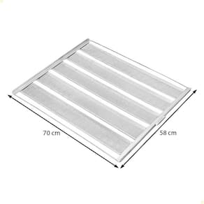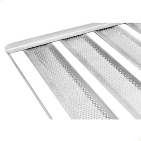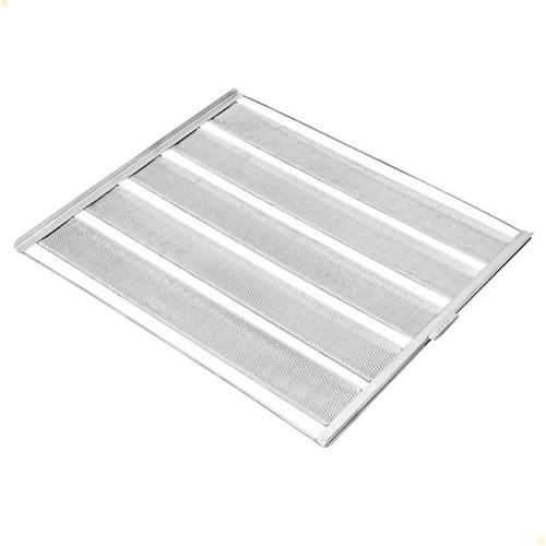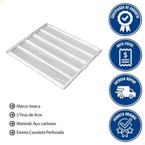 DESCRIÇÃO DA ESTEIRA - Esteira Canaleta Perfurada 5 tiras - Próprio para a fabricação de pão francês. - Estrutura Arco: Aço Carbono (ferro) - Esteiras de tiras em Alumínio Perfurada - 5 Tiras de 9cm alumínio para pães de 100g - Medida Total: 58cm L x 70cm C - Unitário