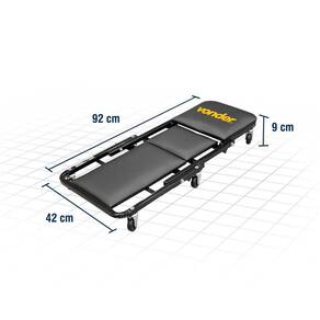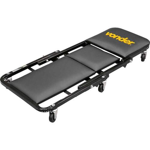 Esteira para mecânico roda giratória 2 em 1 VONDER Equipamento prático que pode ser como esteira e banqueta. Possui seis rodízios em polipropileno e apoio especial forrado para a cabeça. Dobrável e fácil de transportar. Conteúdo: 1 Esteira para mecânico 2 em 1. Material da esteira para mecânico: Estrutura reforçada em metalon com base rígida em aglomerado, forrado com espuma e revestido com material sintético | Tipo de roda(s): 6 rodas rodas giratórias | Cor da esteira para mecânico: Preta | Dimensões aberta: 9 cm x 42 cm x 92 cm | Dimensões fechada: 35 cm x 42 cm x 43,5 cm | Capacidade máxima: 110 kgf | Massa aproximada (peso) (kg): 0.45 kg