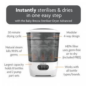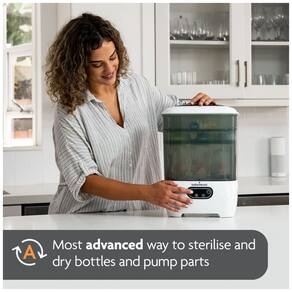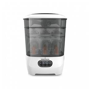 Esteriliza automaticamente mamadeiras secas, peças de bomba tira leite, chupetas, mordedores, copinhos, brinquedos e outros acessórios em uma etapa fácil, economizando tempo. Tensão de alimentação 120V 60Hz. Potência 750W. O vapor natural esteriliza efetivamente garrafas de qualquer tamanho de marca, acessórios de peças de bomba Em seguida, seca com ar filtrado HEPA substituível que é 95 livre de germes Os produtos permanecem esterilizados internamente por até 24 horas A maior capacidade comporta 8 garrafas e 2 conjuntos completos de peças de bomba Use 4 maneiras e recursos 4 funções Possui compartimento inferior grande, compartimento superior mais curto e bandeja de acessórios exclusiva Use como esterilizador, secador, somente esterilizador, somente secador ou sistema de guardar e nunca mais use um escorredor sujo Fácil de usar com painel de controle LCD com botão de pressão Marca: Não Informado