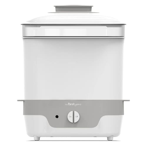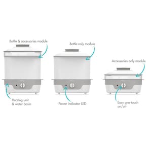 The First Years Esterilizador modular de mamadeira – esterilizador de mamadeira de bancada – higieniza mamadeiras, chupetas, peças de bomba de leite – Suprimentos de alimentação para mamadeiras - Modular: O design da torre com duas bandejas oferece muito espaço para esterilização enquanto economiza espaço no balcão. Use a bandeja ou ambas conforme necessário - Vapor limpo: usa vapor para esterilizar; não há necessidade de produtos químicos agressivos - Limpeza personalizada: a bandeja superior é perfeita para mamilos, mordedores, peças de bomba de leite e itens menores; a bandeja inferior é especialmente projetada para mamadeiras, copos e itens maiores - Design inteligente: direciona o vapor dentro de garrafas e copos para uma limpeza completa - Pronto quando você estiver: o esterilizador armazena itens por até 24 horas