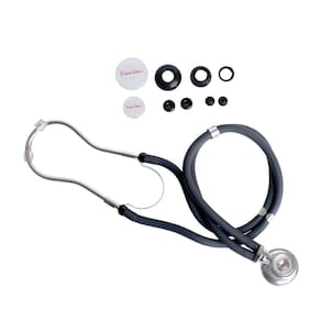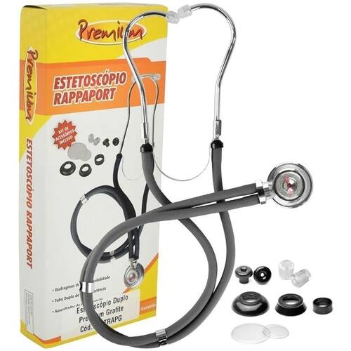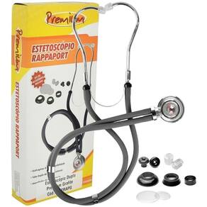 O Estetoscópio Rappaport Premium é indicado para a ausculta cárdio-respiratória. Ele é um esteto completo com tubo duplo para ausculta mais clara e precisa. Inclui olivas e diafragmas para conversão em diferentes formas de uso. É um aparelho de uso médico que requer treinamento e prática para o uso correto. Mais detalhes do Produto:- Uso adulto e pediátrico: Sim;- Diafragmas super sensível: Sim;- Tubo duplo resistente: Sim;- Produzido com os materiais da mais alta qualidade: Sim;- Conteúdo da Embalagem:- Par de oliva rosqueável dura;- Par de oliva rosqueável macia;- Par de oliva rosqueável silicone;- 2 pares de membranas de plástico rígido;- Anel rosqueado de cobre cromado (Infantil, Adulto);- Base rosqueada de cobre cromado que possibilita troca do sino ou diafragma (Infantil, Adulto);- Câmara de som em liga de alumínio (oxidado ou anodizado);- Tubo rotatório central em cobre cromado;- Tubo duplo de PVC ligado através de anéis metálicos;- Fone biauricular de cobre cromado;- Diafragma aberto (sino prolongador) tamanho pequeno;- Diafragma aberto (sino prolongador) tamanho médio;- Diafragma aberto (sino prolongador) tamanho grande;- Auscultador;O Estetoscópio Rappaport Premium é indicado para a ausculta cardiopulmonar. É um estetoscópio completo, de baixo peso, formado com tubo em “Y” moldado em PVC de peça única para melhor transmissão do som, com fone biauricular em cobre cromado, que permite auscultar simultaneamente o som com os dois ouvidos e auscultador para ausculta mais precisa e eficiente.Possui par de olivas macias e diafragma de alta sensibilidade, uma câmara de som em liga de alumínio e anel rosqueado de cobre cromado. Os sons são obtidos através do contato do diafragma com o organismo e são transmitidos através da câmara de som, tubo transmissor, tubo de PVC e auriculares até o ouvido do profissional. - Características:- Leve e compacto- Diafragmas de alta sensibilidade- Tubo moldado em PVC de peça única para melhor transmissão do som- Fone biauricular em cobre cromado- Par de olivas macias- Indicações: indicado para amplificações dos sons pulmonares, cardíacos e demais sons do corpo - ITENS INCLUSOS:01 Estetoscópio Duplo Rapapport Premium01 Par de Olivas Macias01 Par de Diafragmas de alta sensibilidade01 Auscultador de Dupla função01 Manual de Instruções GARANTIA 01 Ano **Produto com selo do Inmetro. *Registro na Anvisa: 80275310063.