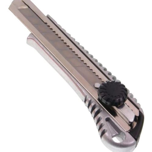 Possui corpo em liga de alumínio: mais resistência - Guia metálica: precisão e segurança - Botão parafuso giratório que permite travar e lâmina facilitando seu manuseio - Design especial para melhor agarre - Acompanha: 1 lâmina. - Tamanho da lâmina: 18 mm