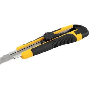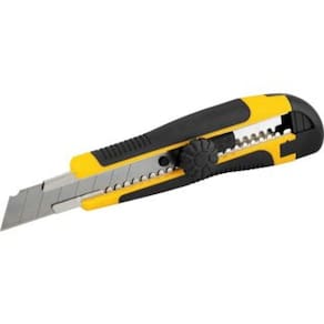 Possui corpo em plástico reforçado revestido com borracha termoplástica que confere maior conforto para o operador. Conta ainda com guia metálica, botão parafuso "giratório", que permite travar a lâmina facilitando o manuseio, e compartimento com 1 lâmina sobressalente. Lâmina segmentada em 7 partes, proporcionando maior aproveitamento.