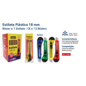 ESTILETE PLÁSTICO GATTE 18MMCaracterísticas:- Material: Aço e Plástico- Cabo Anatômico- Largura da Lâmina: 18mm- Comprimento do corpo: 14,7 cm- Com trava de Segurança: Sim- Com quebrador de Lâmina: SimProduto pode ser enviado nas cores : Verde, Amarelo, Azul ou Vermelho (Sem possíbilidade de escolha)