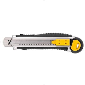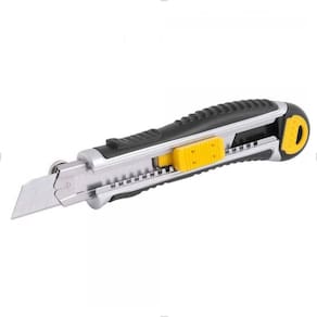 Possui corpo metálico reforçado revestido com borracha termoplástica que confere maior conforto para o operador. Conta ainda com botão de ajuste com sistema de travamento automático da lâmina, que proporciona melhor manuseio, sistema de reposição automática das lâminas para maior comodidade e compartimento para 5 lâminas. Indicado para fazer cortes em geral.
