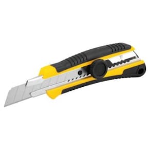 Possui corpo em plástico reforçado revestido com borracha termoplástica que confere maior conforto para o operador. Conta ainda com guia metálica, botão parafuso ''giratório'', que permite travar a lâmina facilitando o manuseio, e compartimento para 3 lâminas. Lâmina segmentada em 7 partes, proporcionando maior aproveitamento.