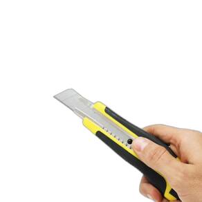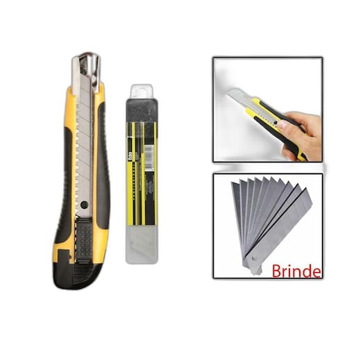 Estile profissional para uso de diversos materiais, com segurança e exatidão. Sua ponteira deixa a lâmina firme podendo fazer cortes exatos e seguros além de seu botão ter uma trava possibilitando sua segurança. Seu corpo emborrachado possibilita uma firmeza no momento do corte. O Usar com materiais de segurança ajuda a manter um trabalho seguro e evita cortes. Junto com o estilete receba um caixa com 110 lâminas de aço tamanho 18mm. Descrição: - Estilete Largo Profissional 8RO ; - Marca: Eda; - Comprimento: 165 mm; - Com 2 Lâminas Extra No Cabo de 18 mm; - Aparelho Com Trava de Lâmina; - Material: Aço Carbono e PVC.