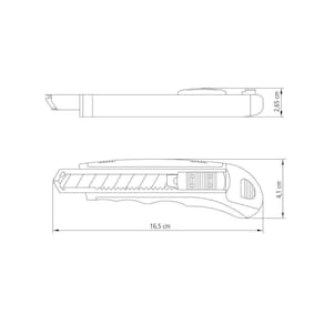 Corpo injetado. Lâmina em aço especial temperado. Estrutura interna de metal. Sistema de troca rápida da lâmina. Compartimento para guardar lâminas extras. Sete lâminas extras. Empunhadura emborrachada. As ferramentas são submetidas a testes de aplicação prática para garantir sua resistência durante o uso. Estiletes profissionais, compactos e ergonômicos. Sistema de troca rápida das lâminas. As ferramentas são produzidas e testadas conforme normas específicas.