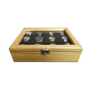 As características das caixas para relógio são as seguintes: - Padrão Marfim. Flocado de Preto; - Produto fabricado em madeira maciça de qualidade; - Revestimento interno aveludado, inclusive as divisórias; - Fecho giratório de pressão em metal suporta cadeado ; - Tampa de vidro de 2 milímetros; - Acompanha almofadas para todos os casulos; - Medidas aproximadas dos casulos larg x comp x alt : 7,5 x 7,5 x 7,5 cm.
