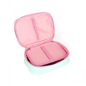 Possui um único compartimento com elásticos e zíper personalizado, garantindo organização prática e fácil acesso aos itens. Seu design é divertido e colorido, tornando o estojo atraente para crianças e proporcionando durabilidade no uso diário.
