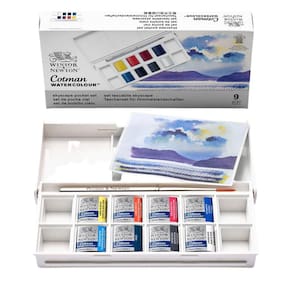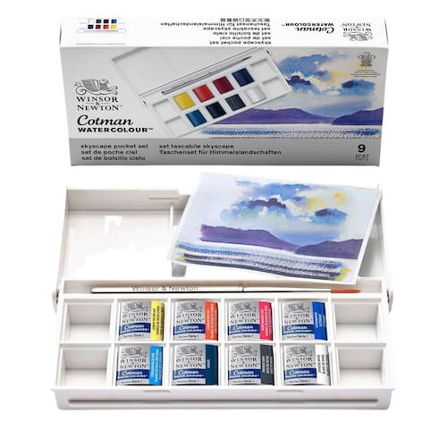 Estojo de Aquarela Winsor & Newton Cotman SKYSCAPE é composto com uma seleção de cores direcionadas para a pintura com tons de céu Estojo cuidadosamente desenvolvido para o artista que deseja usufruir do prazer de pintar ao ar livre, transportando facilmente todo o material que necessita. Aquarela com excelente poder nas cores e transparência inigualável. Estojo composto por 8 pastilhas Cotman e 1 Pincel Winsor & Newton acomodados em um lindo e compacto estojo que pode ser utilizado como godê na mistura das cores. Cores do Estojo: Lemon Yellow Hue Cadmium Red Hue Rose Madder Hue Ultramarine Cerulean Blue Hue Indigo Paynes Grey Chinese White
