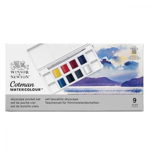 Estojo de Aquarela Winsor & Newton Cotman SKYSCAPE é composto com uma seleção de cores direcionadas para a pintura com tons de céu Estojo cuidadosamente desenvolvido para o artista que deseja usufruir do prazer de pintar ao ar livre, transportando facilmente todo o material que necessita. Aquarela com excelente poder nas cores e transparência inigualável. Estojo composto por 8 pastilhas Cotman e 1 Pincel Winsor & Newton acomodados em um lindo e compacto estojo que pode ser utilizado como godê na mistura das cores. Cores do Estojo: Lemon Yellow Hue Cadmium Red Hue Rose Madder Hue Ultramarine Cerulean Blue Hue Indigo Paynes Grey Chinese White Ean: 884955081136