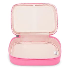 O 100 Pens é um estojo estruturado e espaçoso, com uma divisória central que possui elástico para acomodar lápis e canetas. O modelo é ideal para o dia a dia escolar ou até mesmo para guardar maquiagem.
