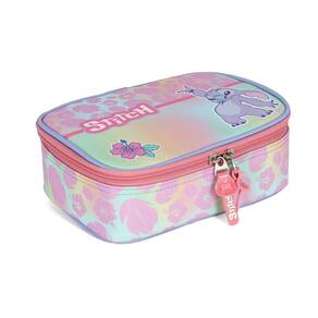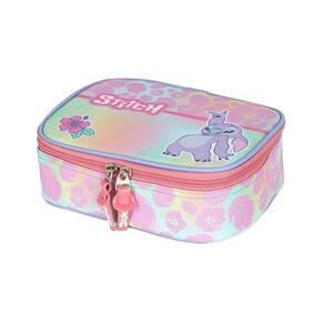 Estojo Box é super espaçoso e cabe todos os seus materiais de escrita. Ele é composto por uma divisória interna com elásticos para separar lápis, canetas e lapiseiras, e os demais materiais vão soltos no compartimento.