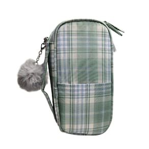 Design Moderno e Charmoso: Com uma estampa xadrez clássica e elegante em tons de Verde e branco, este estojo é um verdadeiro destaque. Acompanha um lindo e fofo chaveiro pompom cinza, preso por uma corrente metálica, que adiciona um toque extra de estilo e personalidade.