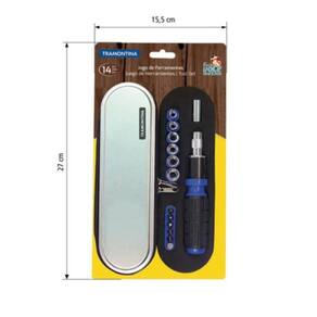 Estojo Com Soquetes E Ponteiras Tramontina 14 Peças Composição variada que oferece versatilidade na utilização do dia a dia. Estes produtos não podem faltar na sua caixa de ferramentas. Recomendações de Uso: Modo de uso: use óculos, luvas e outros equipamentos de proteção de acordo com a tarefa a ser executada. Selecione o tamanho do soquete conforme a bitola do parafuso ou porca. Para operações com parafusadeiras pneumáticas ou elétricas, use soquetes de impacto. Inspecione os soquetes antes de sua utilização. Soquetes que apresentam trincas ou desgaste excessivo devem ser substituídos. Armazene em local limpo e seco.- Foto meramente ilustrativa. Informações Adicionais: