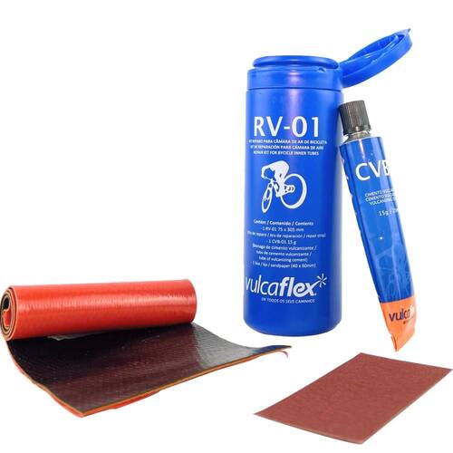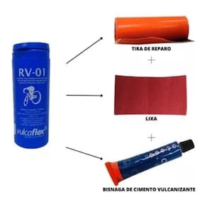 Acompanha: 1 RV-01 (tira de reparo de 75 x 305 mm) 1 CVB-01 (bisnaga de cimento vulcanizante de 15 g) 1 Lixa (40 x 60 mm)