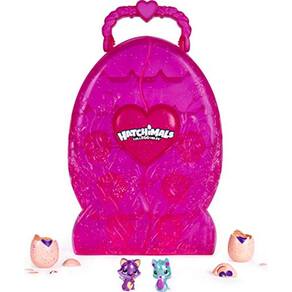Hatch on the go com o Hatchimals CollEGGtibles Collector's Case! Este caso vem com 2 Hatchimals CollEGGGtibles exclusivos e tem espaço para até 26 caracteres! Com uma alça em forma de coração, exterior rosa com glitter e portas translúcidas, esta caixa de transporte é a maneira mais fofa de viajar com seus Hatchimals! Até funciona como um lugar para exibir seus amigos! Abra as portas e você vai descobrir 6 ninhos de cristal virados para baixo. Escondidos dentro de cada porta, esses ninhos são a maneira mais doce de manter seus Hatchimals aconchegantes! Coloque seus 2 caracteres exclusivos dentro dos ninhos e use o resto da caixa de transporte para organizar sua collEGGtion. Você pode até mesmo manter seu caso em sua base e usá-lo para exibir e jogar com seus amigos! Quando for a hora de viajar, basta dobrar os ninhos e fechar as portas! Leve seus Hatchimals onde quer que você vá com o Hatchimals CollEGGtibles Collector's Case!