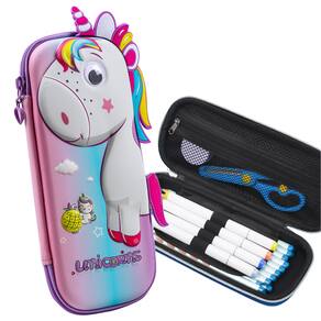Material: EVA Tamanho: 22 cm* 10 cm* 5 cm Peso: 150 g Design adorável de unicórnio — apresenta um unicórnio 3D colorido com crina de arco-íris, adicionando um visual divertido e mágico que agrada a crianças e estudantes. Material EVA durável — Feito de capa dura de EVA de alta qualidade, este estojo de lápis é à prova d'água, à prova de choque e resistente a arranhões, garantindo um uso duradouro. Capacidade de armazenamento espaçosa — Medindo 22 × 10 × 5 cm, esta bolsa para canetas contém várias canetas, lápis, borrachas, réguas e outros itens escolares bem organizados. Protetor e prático — O revestimento rígido e resistente protege o papel de carta contra pressões e quedas, tornando-o ideal para transportar material escolar com segurança. Leve e portátil — Pesando apenas 150 g, esta bolsa de lápis é fácil de transportar em mochilas, adequada para uso diário na escola, jardim de infância e viagens.