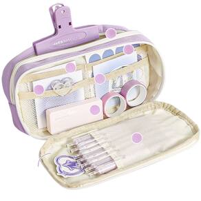 Material: Peso do tecido: 89 g Tamanho: 220 mm* 70 mm* 120 mm Design adorável de coelhinho e pingente — apresenta um lindo adesivo de coelho, pingente “Keep the Smile” e tom roxo pastel, criando um estojo de lápis divertido e estético para crianças, adolescentes e estudantes. Armazenamento frontal com vários bolsos — Equipada com suportes elásticos de cordão e bolsos externos, esta bolsa para canetas permite fácil acesso a notas, clipes ou cartões, mantendo os itens essenciais organizados. Construção em tecido durável — Feita de tecido de alta qualidade, esta bolsa de lápis é leve, resistente e construída para suportar o uso diário na escola, no escritório ou em viagens. Capacidade interior espaçosa — Medindo 22 × 7 × 12 cm, o compartimento principal oferece amplo espaço para canetas, lápis, réguas, marcadores, borrachas e pequenos itens de papelaria. Organizador prático de papelaria — Uma bolsa versátil para canetas que funciona como bolsa de cosméticos ou estojo de armazenamento para acessórios, tornando-a adequada para meninas, meninos, adolescentes e adultos.