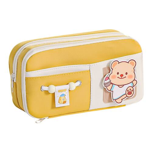 Material: poliéster Peso: 88 g Tamanho: 220 mm* 60 mm* 110 mm Design moderno e fofo: com um design temático de queijo com cores amarelas vibrantes, este estojo de lápis adiciona diversão e estilo ao seu material escolar. Grande capacidade: com várias camadas, oferece amplo espaço para canetas, lápis, borrachas e outros artigos de papelaria, garantindo que tudo permaneça organizado. Durável e de alta qualidade: feito de material de poliéster de alta qualidade, oferece durabilidade duradoura e é fácil de limpar. Perfeito para estudantes: ideal para estudantes do ensino fundamental e médio, este estojo de lápis é uma opção prática e elegante para organizar os itens essenciais da escola. Compacto e portátil: apesar de sua grande capacidade, este estojo de lápis permanece compacto e fácil de transportar, cabendo facilmente em mochilas ou bolsas.
