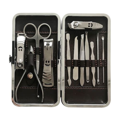 - Kit de unha com 12 peças: 1 cortador de unha grande, 1 cortador de unha médio, 1 cortador de unha pequeno, 1 alicate, 1 lixa, 1 pinça, 1 palito, 2 utensílios de desencravar unha, 1 tesourinha
