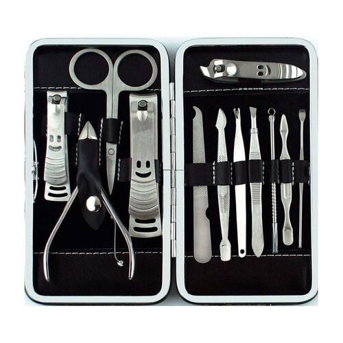- Kit de unha com 12 peças: 1 cortador de unha grande, 1 cortador de unha médio, 1 cortador de unha pequeno, 1 alicate, 1 lixa, 1 pinça, 1 palito, 2 utensílios de desencravar unha, 1 tesourinha