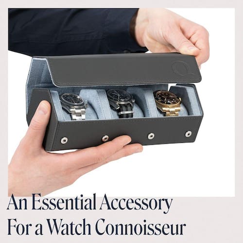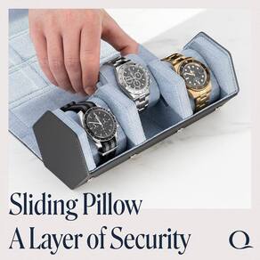 Rolos de relógio portáteis para viagens — Nossos estojos de viagem com rolo de relógio triplo têm o tamanho perfeito para facilitar o transporte. As almofadas em forma de “M” e o trilho deslizante garantem uma bolsa de transporte confortável e segura para relógios