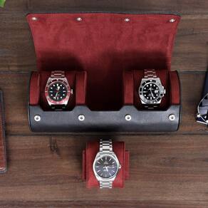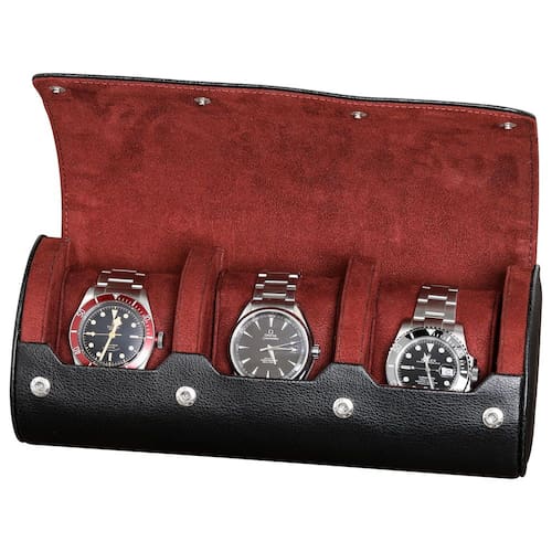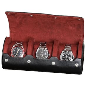 ROTHWELL Estojo de viagem para 3 relógios | Proteção portátil resistente, serve para todos os relógios de pulso e relógios inteligentes de até 50 mm (preto/vermelho) - Separação completa do relógio: cada relógio tem seu próprio compartimento para evitar arranhões. As divisórias sólidas compõem três compartimentos individuais para relógios de até 60 mm para caber perfeitamente. Chega de arranhões nas laterais dos seus relógios de bater uns nos outros como em outros estilos de rolos de relógio! Nosso rolo de relógio mede 24 cm x 10 cm x 6 cm e a circunferência do travesseiro é de 19 cm e é compressível até 16 cm. - Suporte de relógio deslizante: nosso rolo de relógio apresenta um design inovador de almofada deslizante que mantém cada relógio firmemente no lugar. Durante o transporte, os relógios de todas as formas e tamanhos ficam completamente protegidos contra arranhões indesejados. - Parte traseira plana: a parte traseira deste rolo de relógio é plana, então você pode colocá-lo em uma mesa ou mesa sem o risco de ele rolar para fora da borda. Outros rolos de relógio são completamente redondos, deixando-os veneráveis para rolar enquanto estão assentados. - Acessório combinando: cada 3 rolos de relógio é feito à mão pelos mesmos trabalhadores de couro que criam nossas caixas de relógio artesanais. Cada cor combinará perfeitamente com nossas caixas de relógio. Usando 4 botões ocultos para fechar, este rolo de relógio é o acessório de viagem perfeito ou estojo de armazenamento para qualquer entusiasta de relógios. - Presente perfeito: as caixas de relógio Rothwell são presentes perfeitos para o Dia dos Pais, Dia das Mães, aniversários, dia dos namorados, formaturas, feriados, aposentadoria e eventos corporativos. Você certamente encantará até mesmo o destinatário mais difícil de agradar. Nosso design unissex é perfeito para qualquer um dos colecionadores de relógios em sua vida! Ou dê a você mesmo! Seus relógios merecem!