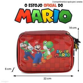 Especificações técnicas: - Material: Poliéster - Cor: Vinho - Modelo: Super Mario Bros - Tipo: Estojo Escolar Duplo - Espaço para lápis, canetas e outros materiais